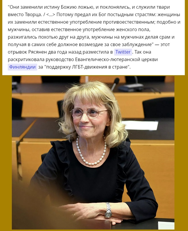 В Финляндии судят экс-главу МВД Пяйви Рясянен за разжигание ненависти к ЛГБТ- сообществу. Поводом послужила библейская цитата, которую она опубликовала в соцсетях. О том, почему дело называют судьбоносным для всей Европы, в материале РИА «Новости».